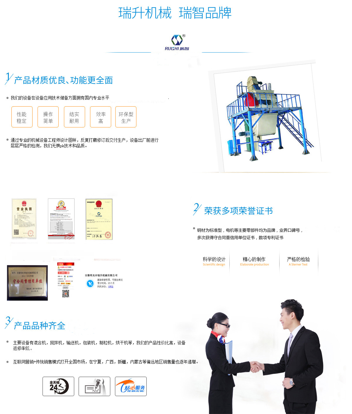 安徽瑞升機械制造有限公司坐落在明光市工業園區,本公司產品主要用于粉料物質,顆粒物質的混合、攪拌、輸送、包裝的自動化生產設備。工廠占地面積為1萬多平方現有6000平方米的生產車間和各類加工檢測設備,具備產品開發、研制、設計、生產、試驗、倉儲運輸等能力,可以生產多種規格、多種非標定制的產品,并有多項技術獲得國家專利,擁有自主進出口權,公司憑借優良的技術、先進的工藝和科學的管理理念,所生產的產品已暢銷全國各地,部分產品已進入馬耳他、印度尼西亞、韓國、羅馬尼亞、沙特阿拉伯、馬來西亞、印度、巴基斯坦、等國家和地區,受到國內外客戶的高度認可和信賴。 本公司獲得守合同重信用單位證書,對原材料的采購極為細致,鋼材為標準型,電機等主要零部件均為品牌,數項專利證書。技術方面我司擁有一支國內的技術和管理團隊,在機械設備應用...公司資質榮譽
